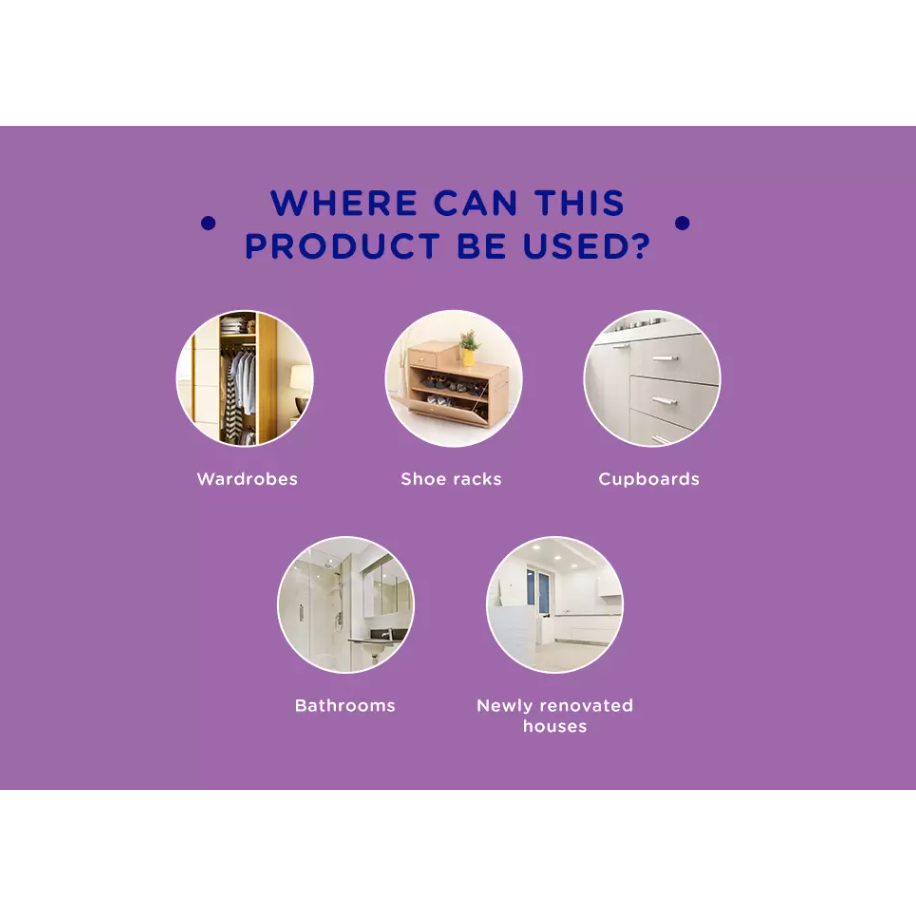 Value For Money:Value for money Performance:Good for keeping moulds and mildew out of cupboards. Best Feature(s):Convenient size Convenient for protecting clothes, bags, books, etc from moulds and mildew caused by humidity.