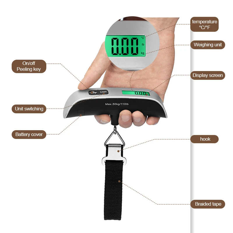 Colour:silver with green Led light Good buying at this price. The device is light and portable. This electronic luggage scale will automatically turn off the power, which can save battery in case you forget to turn it off.