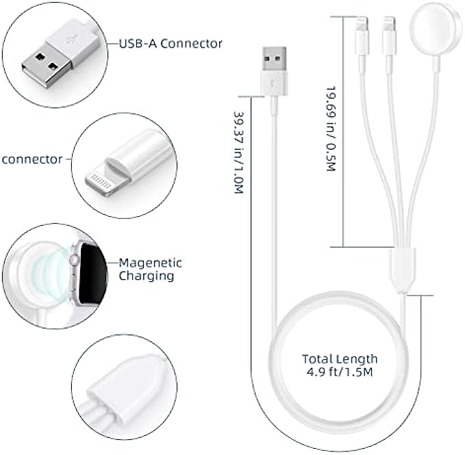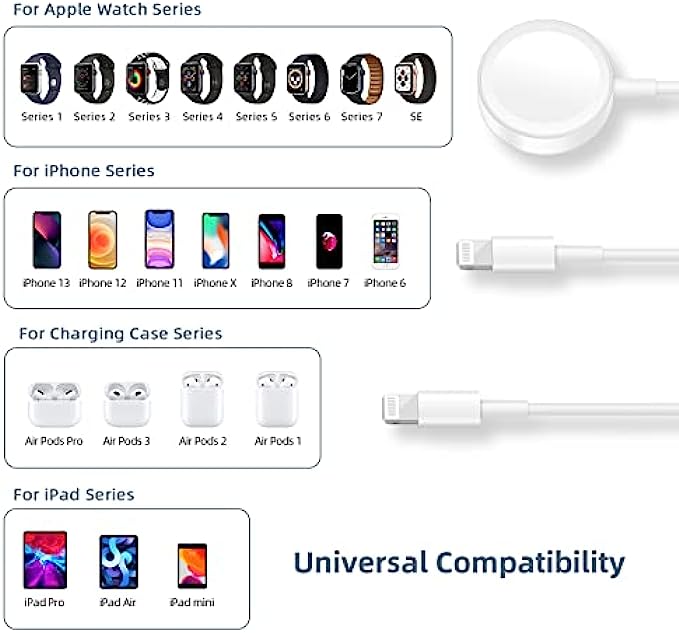 • Universal Compatibility: The 3 in 1 apple watch and phone charging cable is Compatible with all iWatch Series 7/6/5/4/3/2/1/SE and iPhone /iPad/Airpods Series.