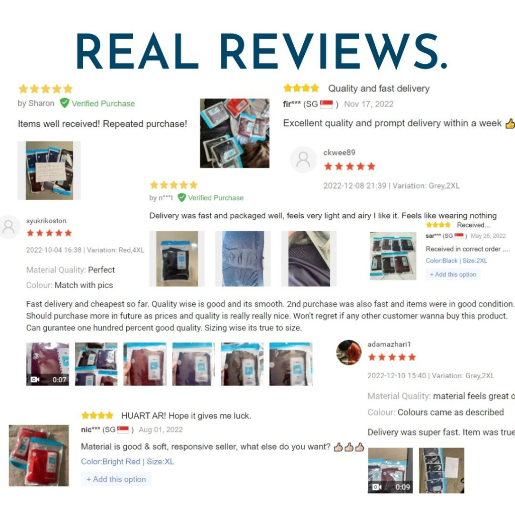 Colour:good to have more light colours available Material Quality:soft and comfortable Items received earlier than expected and in good condition. Good offer for ‘Buy 6 Free 1’. Feeling great and comfortable when putting on. Thank you Seller & Shopee for this smooth transaction ???