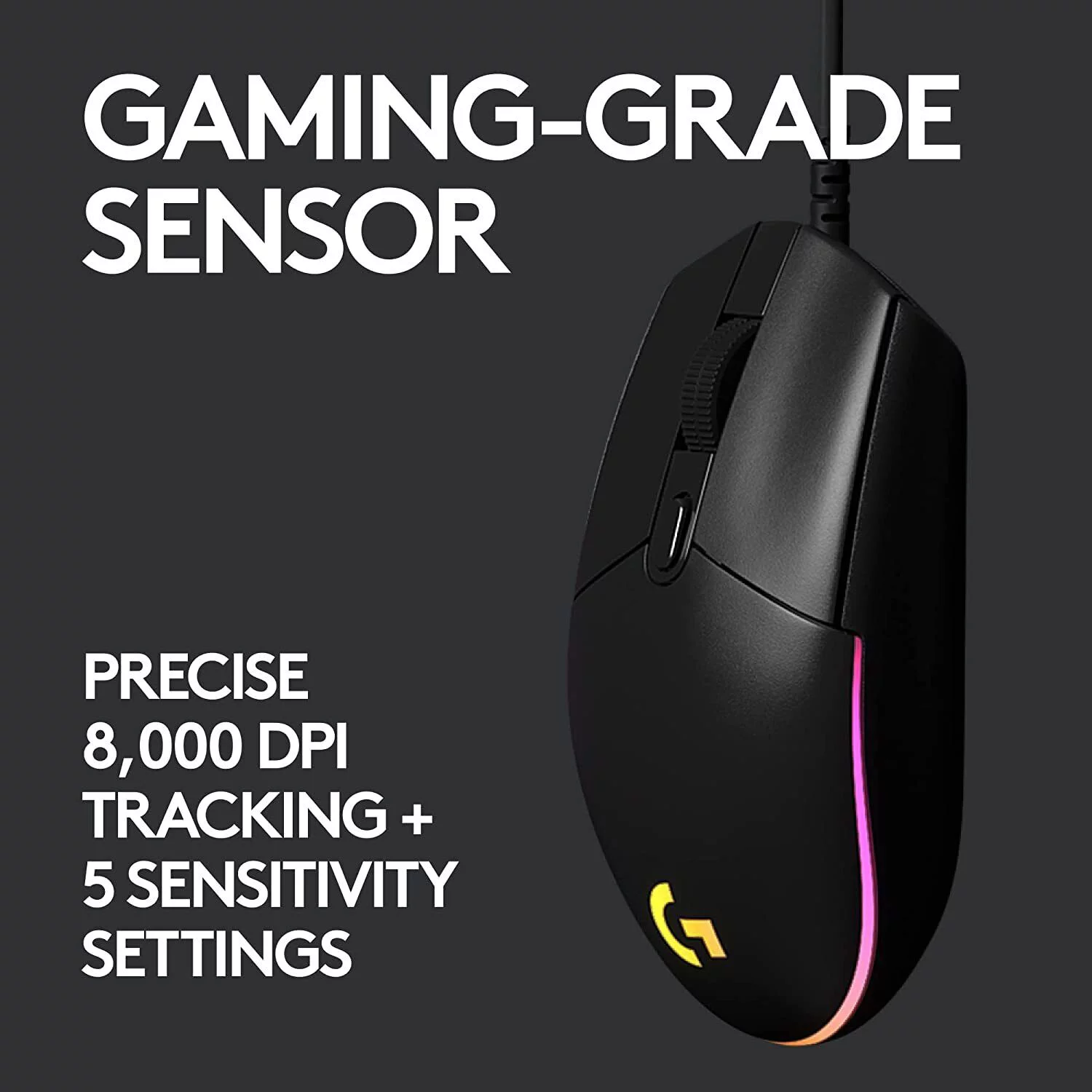 8,000 DPI gaming-grade sensor responds precisely to movements. Customize your sensitivity settings to suit the sensitivity you like with Logitech G HUB gaming software and cycle easily through up to 5 DPI settings.