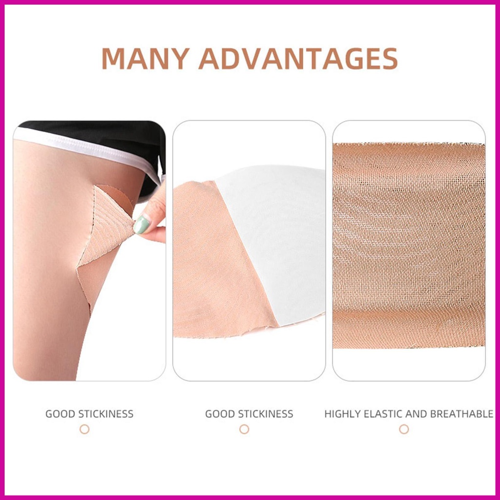 Stays put without peeling off at all even after sweating and i sweat a lotttttt. Really works well and is effective in preventing thighs from chafing and i dont get thigh irritation after sticking these :)) Seamless and doesnt show creases when i tried it on in jeans, but im not sure if it will be visible when wearing white sheer thin bottoms ? Did not irritate my skin at all when wearing and peeling off after 1 whole day, was comfortable, wont get wet even when u pee with it on! BUT, the sticky glue does leave a mark behind after peeling off, no worries tho cos i could easily scrub if off with water and some soap ☺️