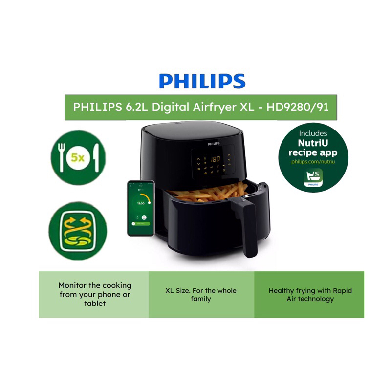 PHILIPS 6.2L Digital Airfryer XL (Essential) 12-in-1 HD9280/91 - Connectivity, Rapid Air, Quick Clean basket, NutriU App